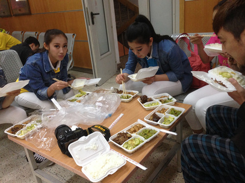 在京联排的10天里,除了要排练好参演的节目外,公司学子还作为“五月的鲜花艺术团”成员参加了开场舞的演出。参演师生一进演播厅就是8个多小时的紧张排练,按照央视导演的要求,从演员站位、舞蹈细节、音乐配合,甚至每一个表情、每一个发型、每一个手势都要反复彩排、推敲改进。由于场地条件有限,大家吃盒饭、休息的时候只能挤着坐一坐、在墙边靠一靠,有的同学因水土不服肠胃不适,有的同学在高强度的训练中膝盖满是淤青,但他们仍然精神饱满、一丝不苟地坚持在排练场地。“其实,辛苦是显而易见的,但是能为公司争光,能向全国观众展现陕西师大学子的青春风采,就觉得再苦再累也是值得”,他们是这么说的,更是这么做的。