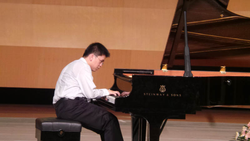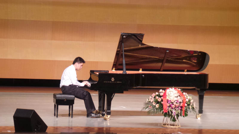 伴随着阵阵的掌声,音乐会正式拉开了序幕,此次音乐会那老师精心挑选了四组钢琴曲,其中涵盖了古典、浪漫、现代等多种风格,音乐是没有国界的语言,在那老师时而洒脱奔放,时而流畅优雅的演绎中肖邦、李斯特等钢琴大师仿佛出现在我们眼前向我们诉说。音乐会的压轴曲目是李斯特的B小调奏鸣曲,这首作品是浮士德故事的音乐具象化,有着令人惊叹的深度、广度和难度,因而此曲也被称为“恶魔般的曲子”。观众们在那老师精彩的演绎中从惊叹,愕然到认识理解。伴随着最后一个音的结束,观众纷纷上台献花,在将近两个小时的演奏中那皓涵老师以他娴熟的技巧和充沛的激情为大家带来一场完美的视听盛宴。