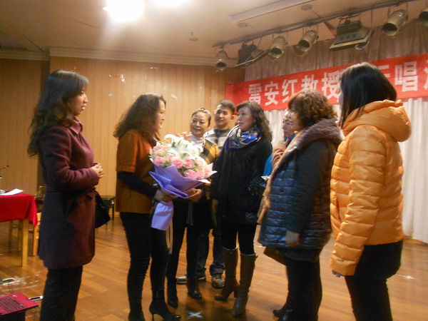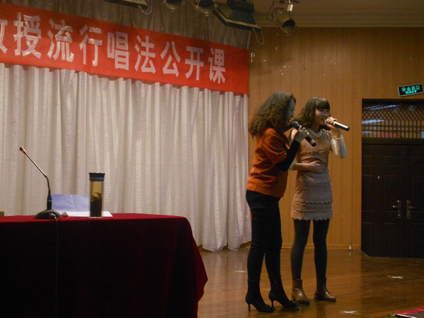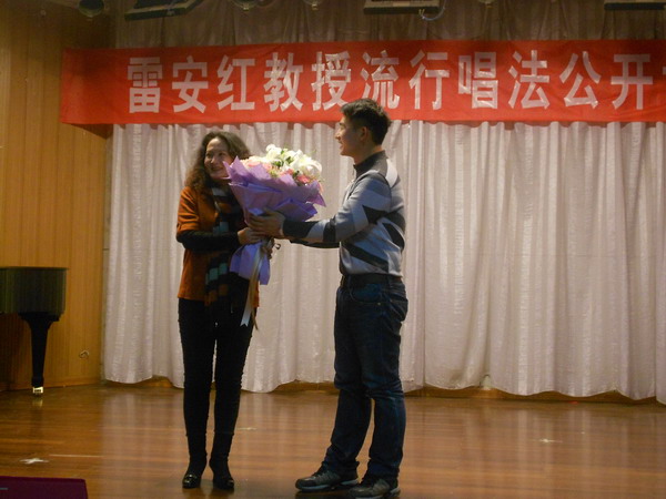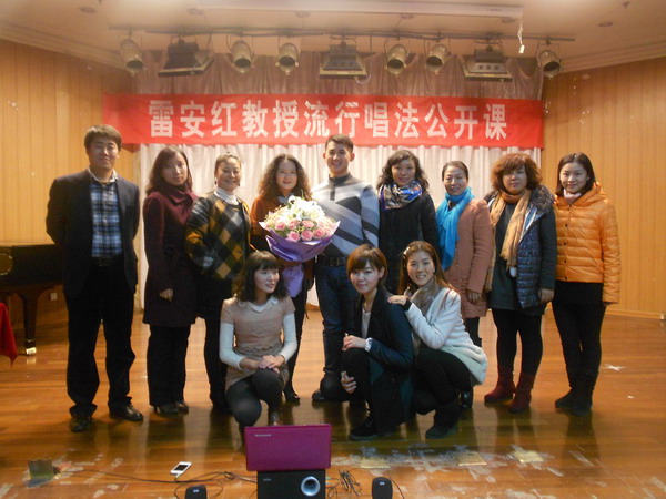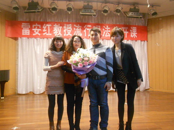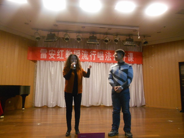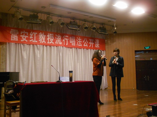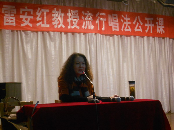 在近三小时的公开课中,雷安红分别给公司2011级免费师范生路婧、2012级钢琴研究生李小桐、2013级声乐研究生王潇进行了演唱指导,她讲了有关流行唱法的发声要领、演唱中应注意的一些常识性的问题,使在座的师生感触颇深。同时她又讲到了流行唱法声部音域的问题:“流行唱法女声声部与男中音同步,男声声部与男高音同样,使大家学到了流行唱法新的理论知识”。雷教授还讲到,流行唱法的声音支点需放在舌头的最中央、流行唱法的虚声是在实声的基础上产生的气声等等,她还强调了学习流行唱法的眼光要放眼全世界,要始终保持声音的独特魅力、个性,用声音的听觉、味觉、视觉、感觉、用心灵的隧道和心口一致去演唱。在互动的环节里,雷安红耐心回答了师生提出关于流行唱法的各类问题,如摇滚、爵士和普通唱法的区别等等,师生们对这些不同种类的流行唱法有了较明确的概念。公开课后,部分师生依依不舍的又和雷教授聊了很多目前关于流行唱法的发展与市场前景的需求等等问题。