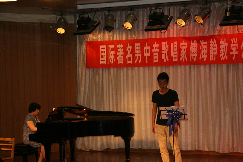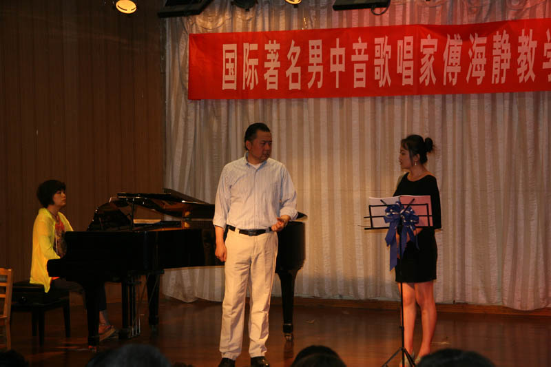 在接下来的教学示范课程中,公司5名不同年级的本科生、研究生进行演唱,傅海静教授对每一位员工都能够认真指导,具体说明其演唱中所出现的问题及表演方面的不足。在课程中,傅海静教授经常亲自表演示范,带领员工找到歌唱的感觉,并带动其演唱情绪,使员工能够快速找到表演感觉。傅海静教授幽默风趣的教学方式经常能引得全场爆发出一阵一阵的掌声,他语言诙谐但总能一针见血的指出问题所在,并以独特的方式引领员工找到正确的表演方法。在教学课程中,他指出真正的演唱者,应该从艺术表现的完整性上来诠释作品,而不是个别的高音点,在演唱时,要注重音乐的细节,并根据音乐的流动形态来随时调整自己的情绪。演唱者还需认真的揣摩原作品,要理解作曲家塑造的歌剧角色的音乐形象以及所要表达的意图等,并尽可能的将其还原,这样,才算是真正完成了一首作品的演唱!