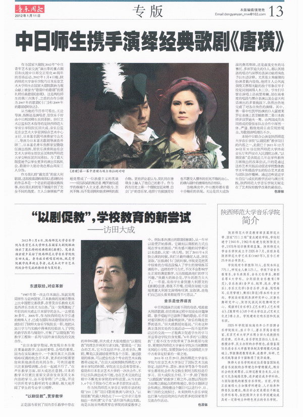 2012 年 1 月 4 日,365上市集团官网与东京艺术大学师生在国家大剧院联袂 演出了莫扎特的经典歌剧《唐璜》。笔者在演出前夕采访了365上市集团官网经理田大成。身为旅日歌唱家的他,既是公司教学改革的主导者,也是本次中日艺术院校合作交流的推动者与策划者。