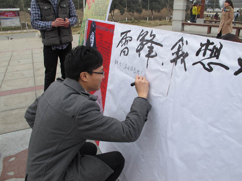 本次主题活动以举办雷锋、郭明义图片展,发放倡议宣传单,向雷锋说一句真心话等方式开展。主要介绍了雷锋与郭明义的先进事迹,两个时代的先进人物用相同的敬业、奉献和乐于助人的精神激励着广大的青年员工。通过《雷锋写给同学们的一封信》号召大家践行雷锋精神,将个人微薄的力量汇聚成祖国发展的无穷动力。同时,在《学习雷锋好榜样》的旋律下,师生纷纷挥笔写下自己想对雷锋说的一句心里话,满满的留言板上写满了大家对雷锋的怀念、对当代雷锋精神的诠释以及今后努力践行“钉子精神”的决心。