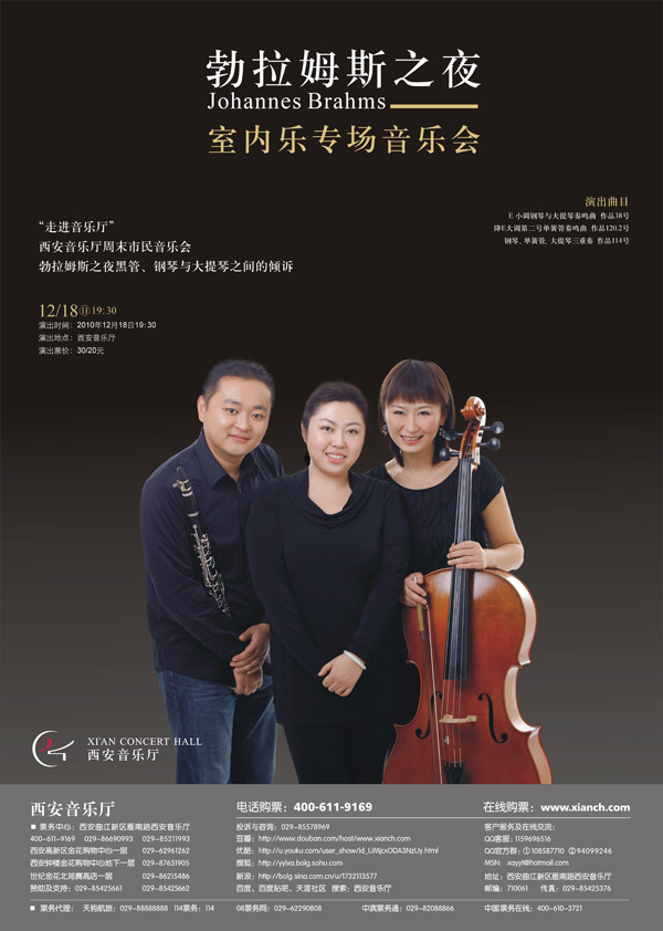 2010年12月18日晚,《勃拉姆斯之夜—黑管、钢琴与大提琴之间的倾诉》室内乐专场音乐会在曲江西安音乐厅室内乐厅举行。公司365上市集团官网音乐表演系青年教师荆嫄(大提琴)、刘洋(钢琴)、万鑫(黑管),为古城的音乐专业师生及各界的音乐爱好者奉献了一场精彩绝伦的室内乐专场音乐会。