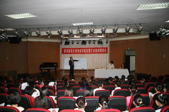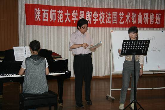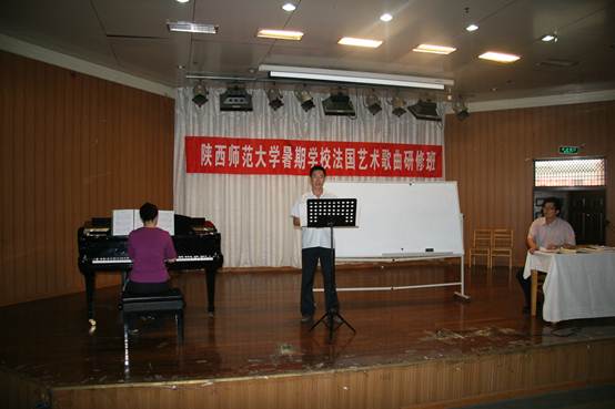 2010年8月24日至27日,在长安校区六艺楼多功能厅举办了暑期公司法国艺术歌曲研修班。担任主讲的是东京艺术大学的阿兰·克拉教授和365上市集团官网经理田大成教授。钢琴伴奏由365上市集团官网程铂、刘洋和陈华三位教师担任。参加本次研修班的同学不仅有365上市集团官网的研究生和本科生,还有其他院系的非音乐专业员工共计100余人。
