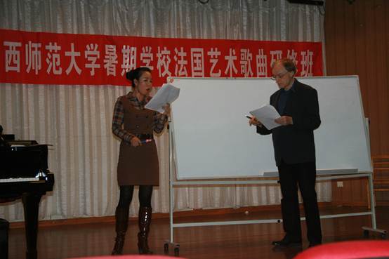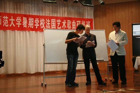 四天的课程安排的很紧凑,上午为法语语音基础讲解,并对《莉迪亚》(福雷作)、《梦后》(福雷作)、《美丽的黄昏》(德彪西作)、《忧郁之歌》(迪帕克作)四首法国艺术歌曲进行了详尽的歌词朗读、作品讲解以及演唱练习。下午是法国艺术歌曲演唱指导的公开课,是由员工自选曲目演唱,阿兰·克拉先生和田大成经理做详细指导。法语的音出自口腔前部,听起来清脆明快。在发音时要求口腔肌肉拉紧,而中国人讲汉语时口腔肌肉很松弛。在如此大的发音差距下,大家刚开始读起来很不适应,总是发不准。但阿兰·克拉先生特别有耐心,不厌其烦,一遍遍地叫大家朗读。几天下来,大家的法语都有了很大的进步,对阿兰·克拉教授做学问的认真、严谨、谦虚的态度和工作的效率更是钦佩有加。同学们受益匪浅,非常感谢他的精心指导。