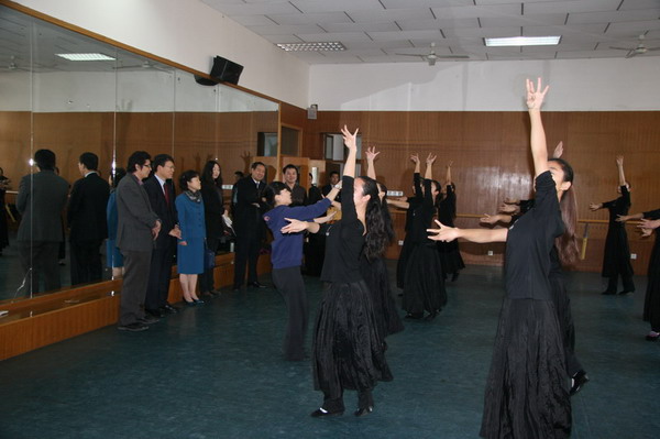 田大成经理陪同全泰东总领事及夫人参观了公司终南音乐厅和公司汉唐乐器陈列室。在终南音乐厅,田经理结合公司与日本东京艺术大学合作演出歌剧《卡门》、《阿依达》的实际情况详细介绍了音乐厅的功能及设施水平。在汉唐乐器陈列室,公司副教授逐一介绍了仿战国瑟、仿唐九品月琴、仿唐花边大阮、秦琴、仿唐葫芦琴、奚琴、仿唐十三弦筝、彩绘羯鼓、敦煌壁画齐鼓、仿唐尺八等珍贵乐器。随后,全泰东总领事及夫人还观摩了公司芭蕾基训、民族民间舞教学,进一步加深了对公司办学情况的了解并予以充分的肯定。
