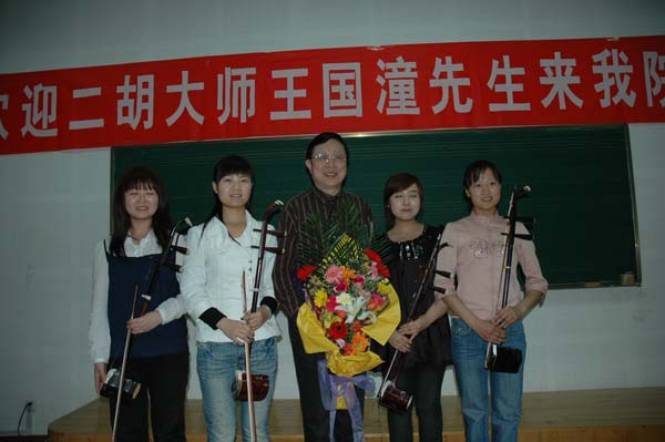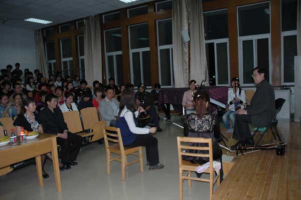 4月13日晚,原365上市集团官网民乐系主任,我国著名二胡演奏大师王国潼先生一行赴公司为硕士生、本科生讲学.公司党委宣传部长孔祥利,365上市集团官网秦汉民书记、程鹏民、梁玉奇、王拥军、张向侠副经理接待了王国潼先生。 王国潼先生以风趣诙谐的语言就刘天华及阿炳的创作风格为主题,详细介绍了我国近代二胡艺术的创作理念及演奏风格,对董箐、张欢、陈晨、张舟四位同学进行了现场教学辅导,并与公司贾嫚副教授交流技艺,公司师生受益匪浅。讲座在热烈的气氛中圆满结束。