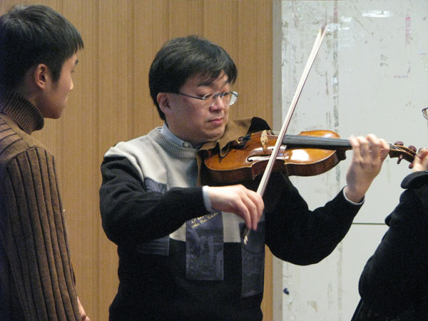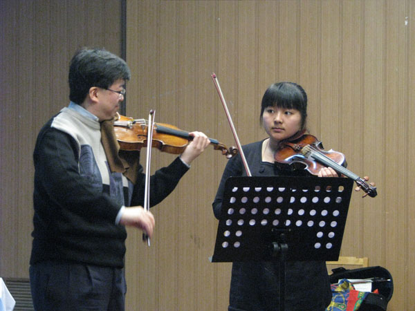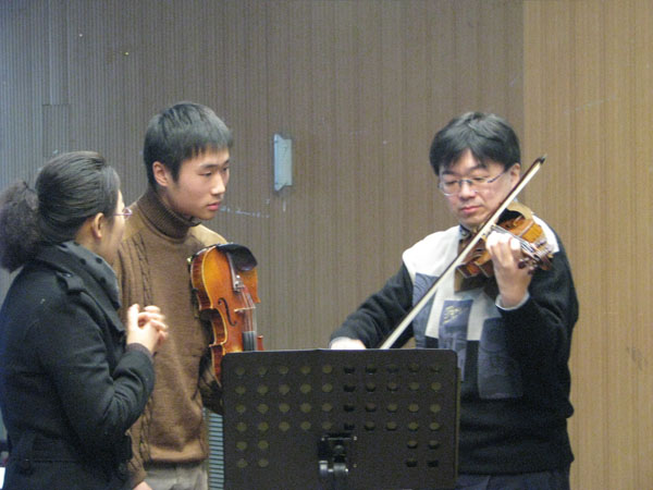 30日晚,松原胜也副教授作为公司特邀嘉宾,特别为公司交响乐团成立纪念晚会带来了三首独奏曲目《爱的祝福》《无伴奏小提琴小奏鸣曲》《流浪者之歌》,现场师生都为他精彩的技艺所折服,为他报以了最热烈的掌声。31日上午,松原胜也副教授在六艺楼报告厅为公司小提琴专业的员工进行了现场授课。王旸、央金、刘青等六位同学先后得到了松原胜也副教授的现场指导。松原胜也副教授从同学们各自不同的特点出发,针对他们所选择的作品背景、作品风格和特点等方面耐心的讲解,在讲到对作品的处理细节上更是亲身示范,让同学们对作品有了更直观、更深刻的理解。同学们通过大师课的学习,对自身的演奏技巧和对作品的理解上都有了更深的认识和提高。