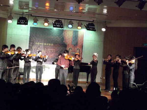 音乐会开场于亮老师带领小提琴专业全体员工合奏了一首大家耳熟能详的《很久很久以前》,接着是于亮老师和员工王旸、央金合奏的《爱的致意》,观众一开始已经陶醉在小提琴轻盈浪漫的琴声中。接下来是员工们的一组独奏,分别由宋扬、刘青、郭青、央金、王旸表演,观众们对员工们精彩的演出爆发出一阵阵掌声,现场气氛十分热烈。听完了员工们的汇报曲目,下面的《菊花台》将音乐会推向了另一个高潮。小提琴、古筝、钢琴为《菊花台》作出了新的诠释,迎着渐暗的灯光走向前台的是舞蹈专业中专班的小姑娘们,观众们为现场的演出惊叹不已。最后,于亮老师带领员工们又合奏了一曲《D大调卡侬》,让人们再次为小提琴所传出的琴声魅力所折服。主持人在音乐会结束之际邀请于亮老师即兴表演了两首曲目,于亮老师精彩的表演为此次音乐会画上了一个圆满的句号。