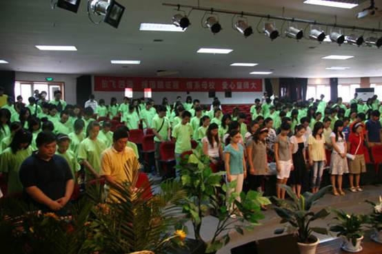 典礼仪式开始前,参加典礼的全体师生起立向四川汶川5.12大地震中遇难的同胞默哀一分钟。