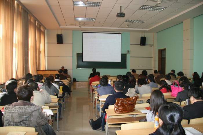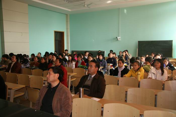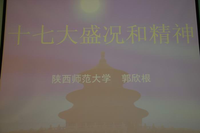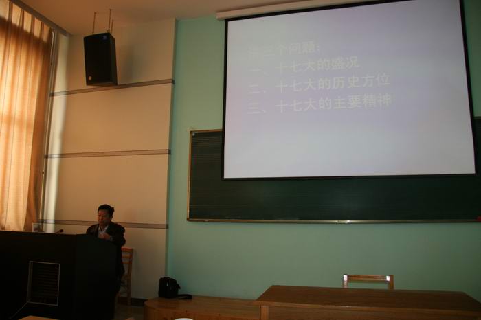 郭欣根教授首先从三个方面宣讲了十七大的盛况,并从时间坐标、空间坐标、思想坐标方面讲解了十七大的历史方位,最后他着重解读了十七大的主要精神,用“一个奋斗目标、两条基本经验、三个根本保证、四位一体的现代化、新时期面临的五化任务、社会建设的六项内容”作了简要的概括。