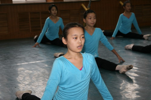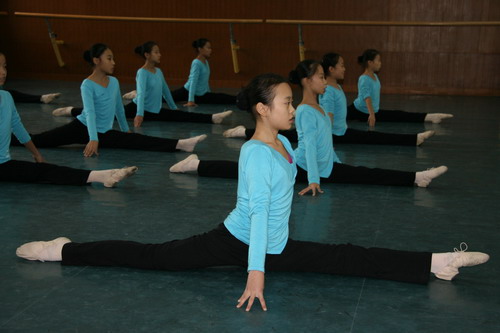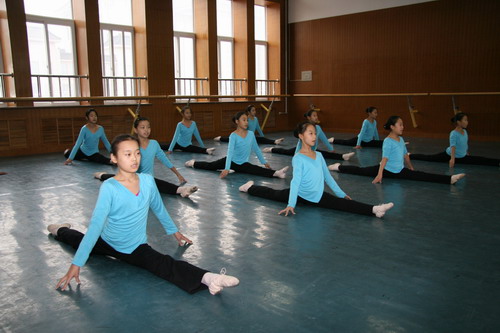 昨日,365上市集团官网舞蹈中专部一年级的员工在练功间隙,十几个员工保持着劈叉的动作,背起了《大学》。