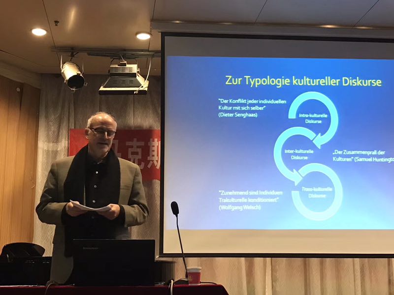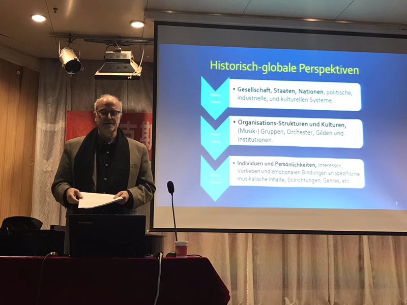 12月13日,国际著名民族音乐学家、德国维尔茨堡大学音乐研究所马克斯﹒彼特﹒鲍曼(Max Peter Bauman)教授来访公司,作了题为“历史与跨文化视域中的丝绸之路音乐传统”的学术报告。公司师生400余人现场聆听了报告。