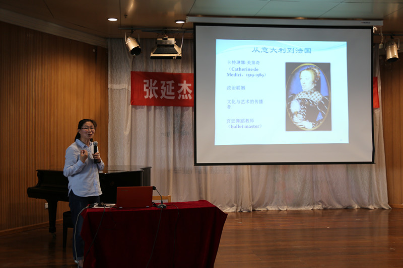 张新梅首先简要介绍了张延杰的学术简历。之后张延杰以生动有趣的实例引导大家探寻芭蕾艺术渊源,并由当下芭蕾舞形式回顾芭蕾舞的时代特征,逐步梳理了芭蕾舞的发展脉络。张延杰借助图片资料详尽地讲述了文艺复兴时期的思潮、绘画中的舞蹈以及图像中的宫廷舞蹈等;并利用视频资料详细介绍了15-16世纪意大利宫廷舞蹈的分类,讲述了文艺复兴时期宫廷舞蹈的审美标准和艺术内涵,以舞蹈为契机探究了人文主义精神在文艺复兴时期的发展理路。讲座最后,张延杰带领我们追溯了芭蕾历史,从意大利到法国,走进芭蕾的前世与今生,让大家更加清楚地了解了芭蕾的衍变。之后她又向同学们提出期许,在今后的研究中,希望同学们能打开视角,去思考艺术形式所反映的时代风貌以及艺术思潮。