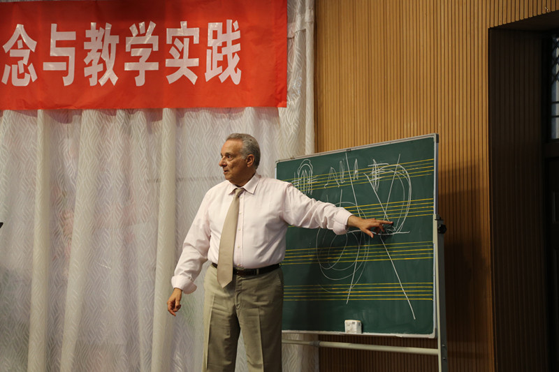 讲座伊始,安提诺里教授从生理结构和气息位置讲述了意大利传统美声的唱法,并分别介绍了男、女不同的呼吸方法。他说,“真正的声乐演唱者在演唱时应该注意喉腔的打开,尤其在气息的运用时,横膈膜一定要保持”,同时还为我们做了示范。在示范时,安提诺里教授还生动形象的在黑板上画出了声音的走向,用一条弧线和直线直观的告诉我们声音应往何处。他结合自己多年反复练习的经验,教大家如何鉴别自己的喉咙是否打开,他用手指敲击喉咙,若声音空旷就说明已打开,反之则未打开。安提诺里教授在讲述中,既告诉大家多个行之有用的练习小技巧,又在提醒大家在练习中及时反思已达到更加高效的训练目的。