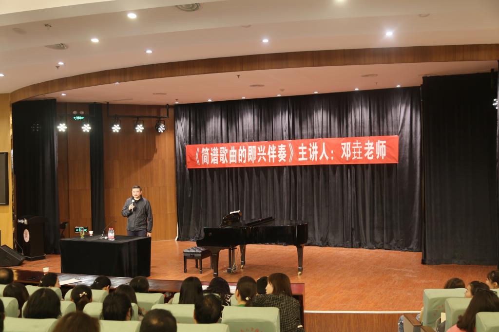 邓垚老师以《简谱歌曲的即兴伴奏》为题,采用大家耳熟能详的歌曲《送别》《FLY ME TO THE MOON》为配弹实例,逐句讲解其和声的布局、织体的设计,以正三和弦为设计蓝本,逐步加入副三和弦、重属和弦以及副属和弦,在一次次变化中表达稳定——不稳定——稳定的音乐动力,以及富有内涵的音乐思想。