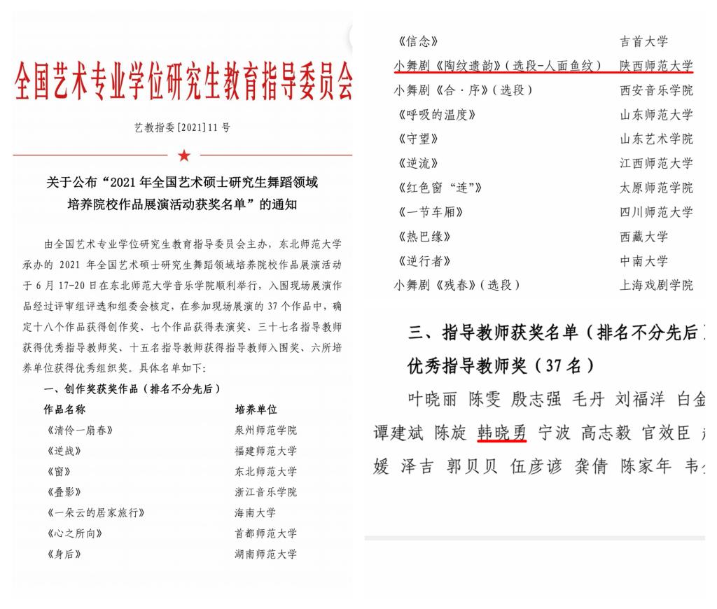 近日,公司艺术硕士研究生原创小舞剧《陶纹遗韵》(选段-人面鱼纹)在全国作品展演中荣获“创作奖”,指导教师、副经理韩晓勇副教授荣获“优秀指导教师奖”。本次艺术硕士作品展演活动由全国艺术专业学位研究生教育指导委员会主办、东北师范大学承办。