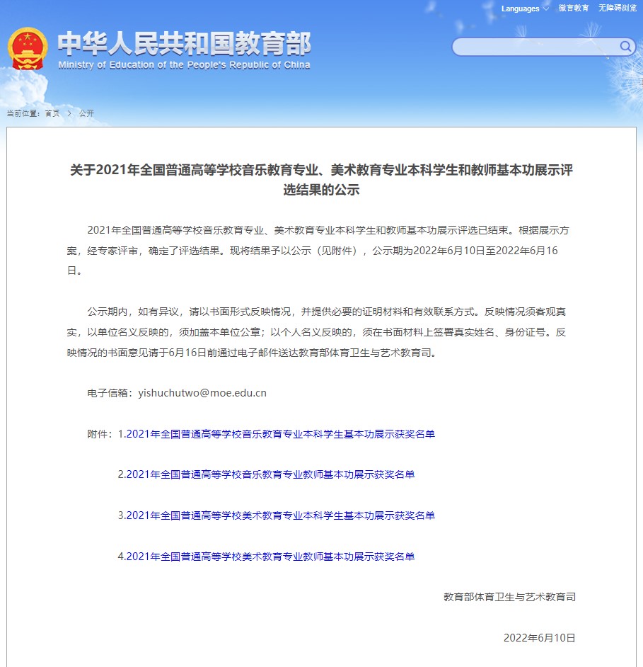 附:关于2021年全国普通高等公司音乐教育专业、美术教育专业本科员工和教师基本功展示评选结果的公示 - 中华人民共和国教育部政府门户网站http://www.moe.gov.cn/jyb_xxgk/s5743/s5745/A17/202206/t20220610_636343.html