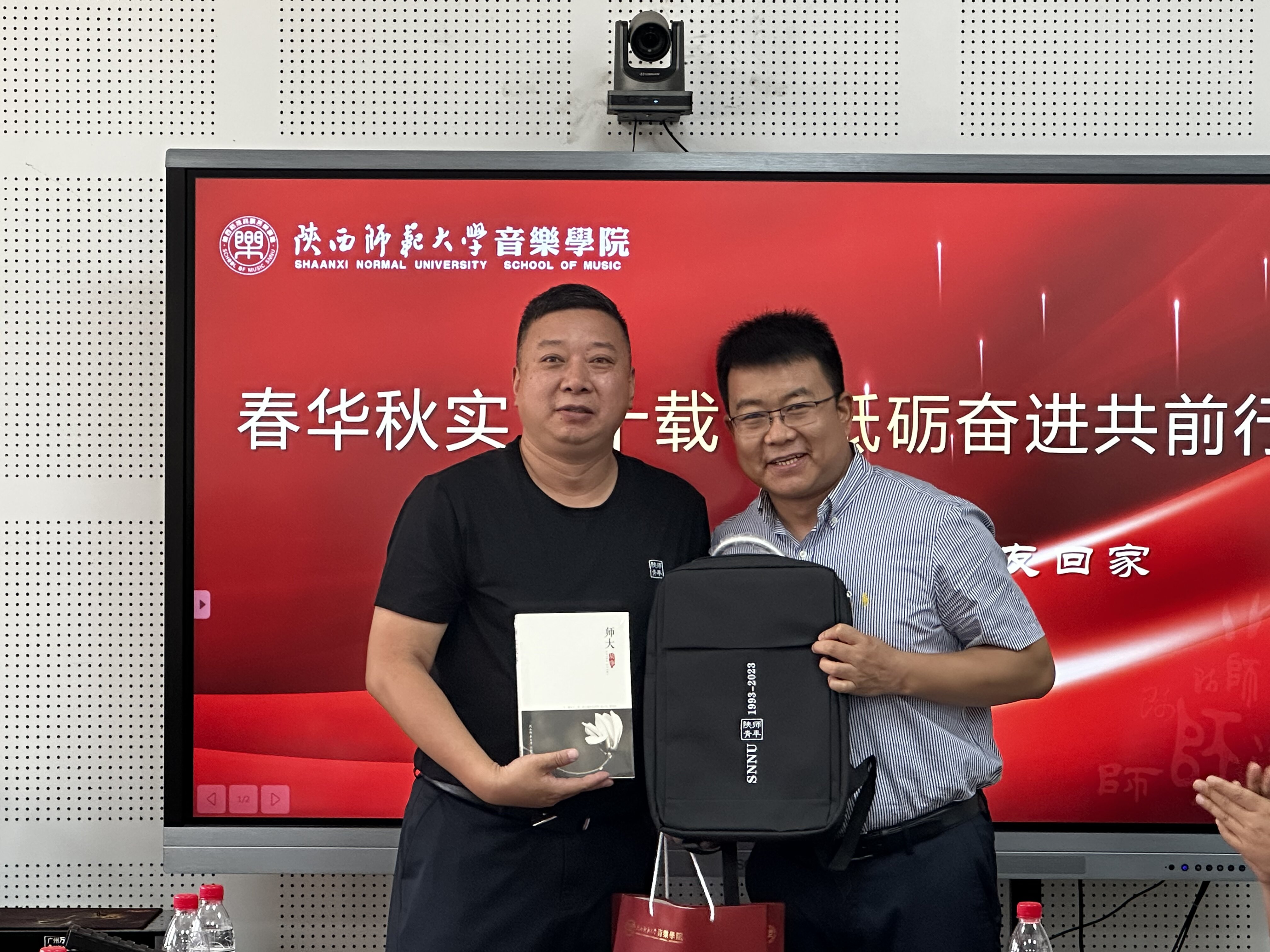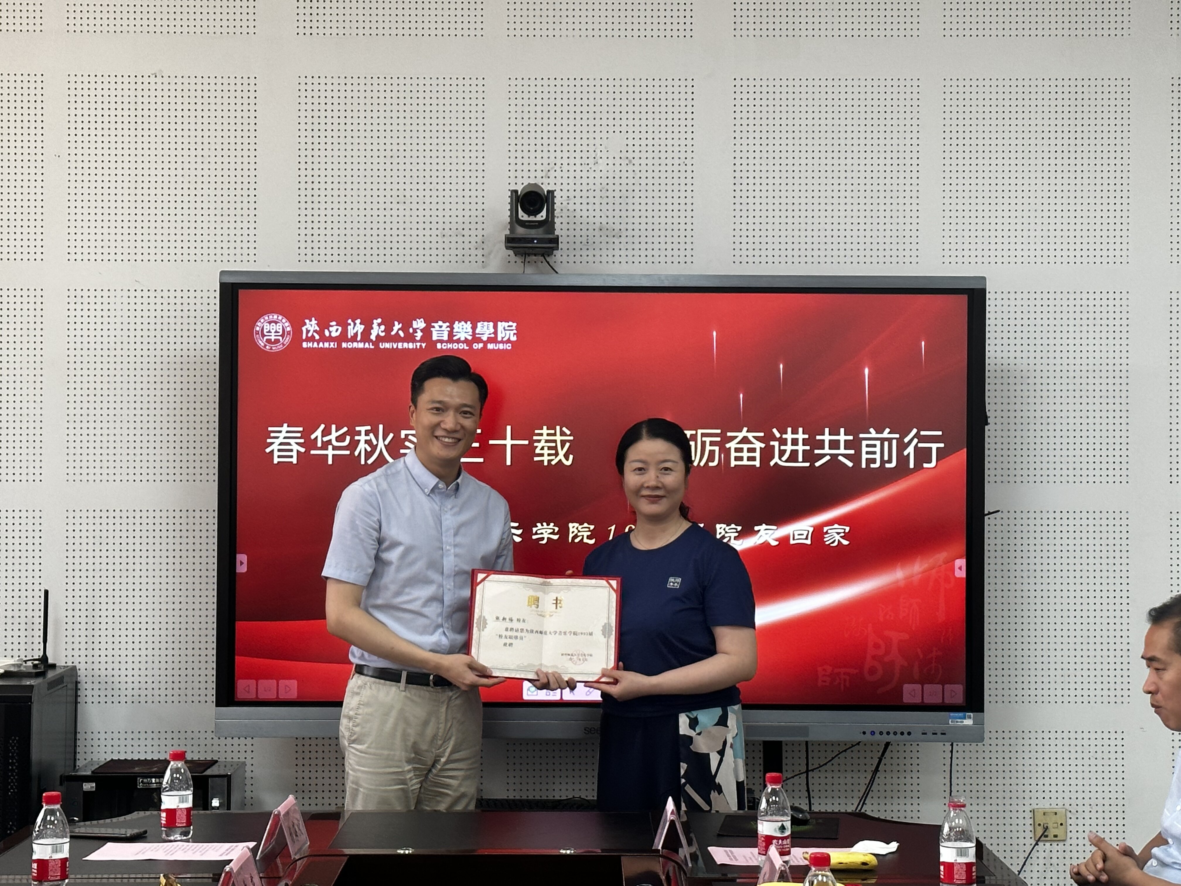 党委书记范玮熠为1993届员工联络员张新梅颁发聘书。经理黄键代表公司为1993届员工赠送了纪念品,每一份纪念品都承载着公司对1993届员工的美好祝福。副经理郭元代表公司接受员工为公司赠送的纪念品——高低音谱号的雕塑,象征着公司对一代代音乐学子的孕育培养。