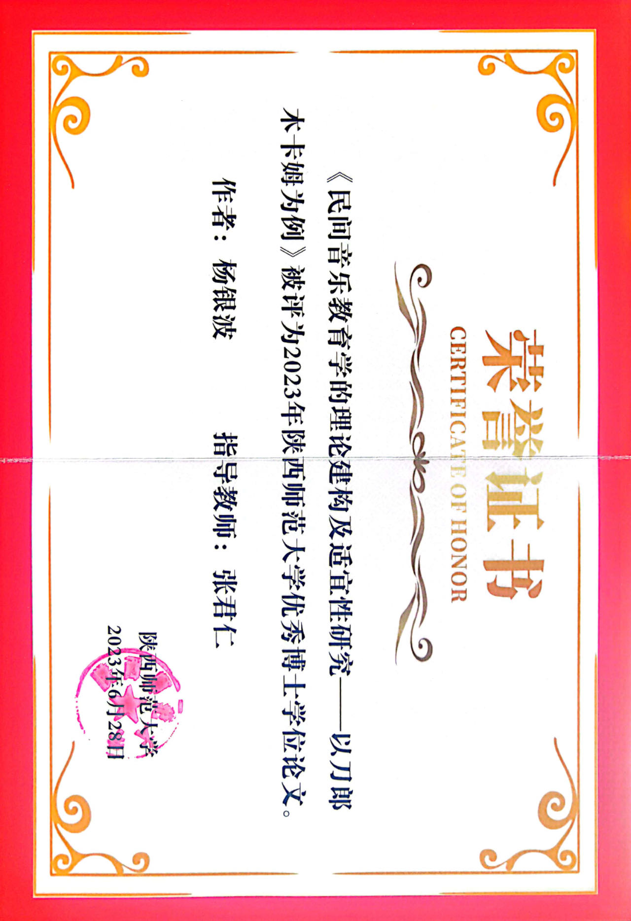 杨银波是公司2019级课程与教学论专业(丝绸之路各民族传统音乐传承与教育研究方向)博士研究生,导师是张君仁教授。该生在校四年勤奋踏实,成绩优秀。四年间在专业学术刊物发表学术论文九篇,其中CSSCI期刊6篇(含权威期刊3篇),参与国家社科基金3项,省部级课题6项,主持博士研究生自由探索项目1项,获得国家奖学金一次,积学一等奖学金四次,获得省级以上科研奖3项,获得陕西省优秀毕业生荣誉称号。