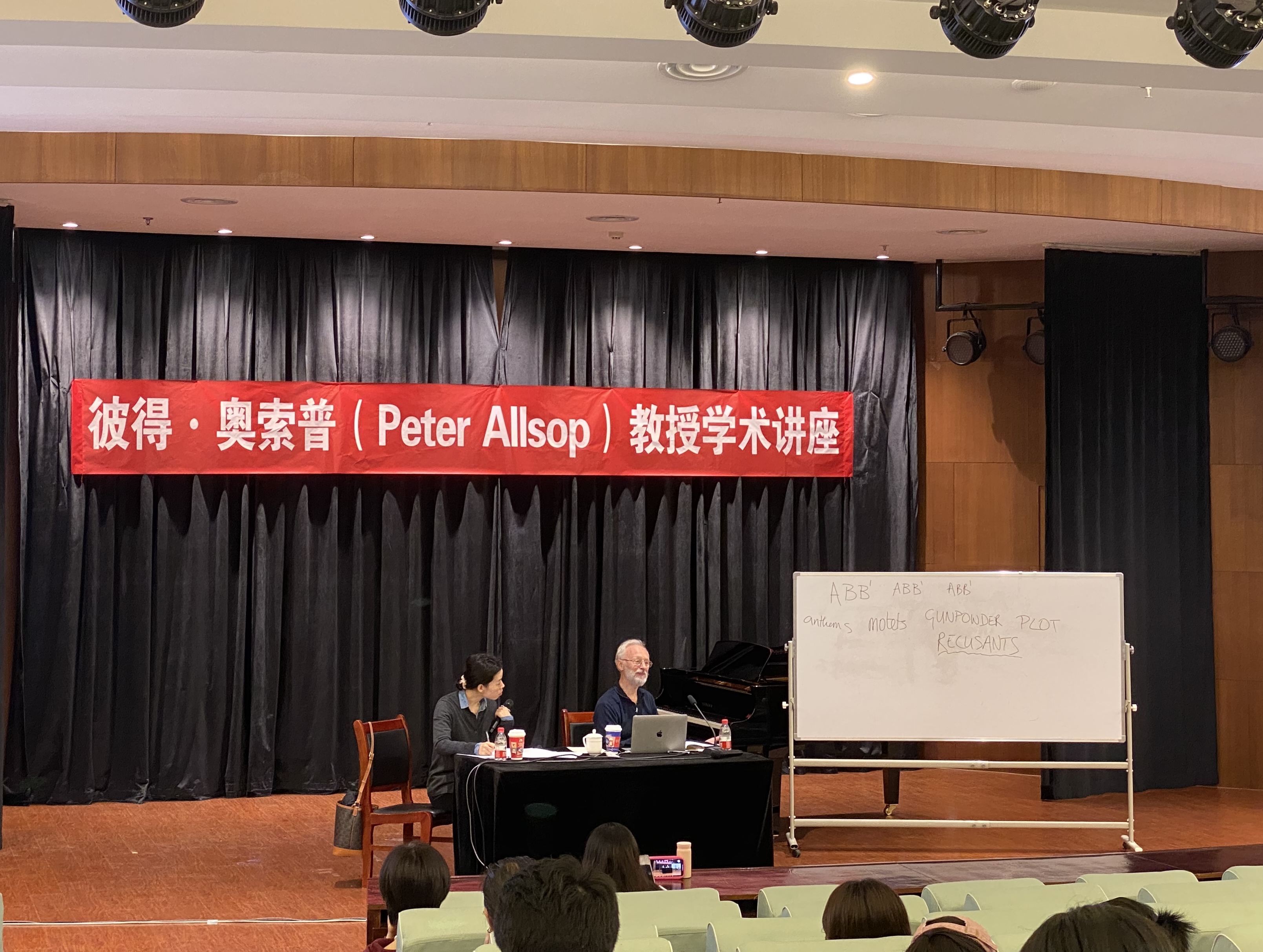 整场讲座最有趣的环节莫过于对亨利八世的逸闻轶事的讲述,别有风趣地为讲述了伊丽莎白女王身世的由来,从而引出伯德在国教音乐方面的创作。伯德对待宗教音乐的态度很开明。随后,教授从歌词语言和音乐风格两个方面对罗马天主教音乐和英国国教音乐进行比较。教授强调,伯德会根据不同场合使用两种音乐风格,而他对罗马教会音乐的使用体现在他的四声部弥撒、经文歌等充满对位技巧的作品中。