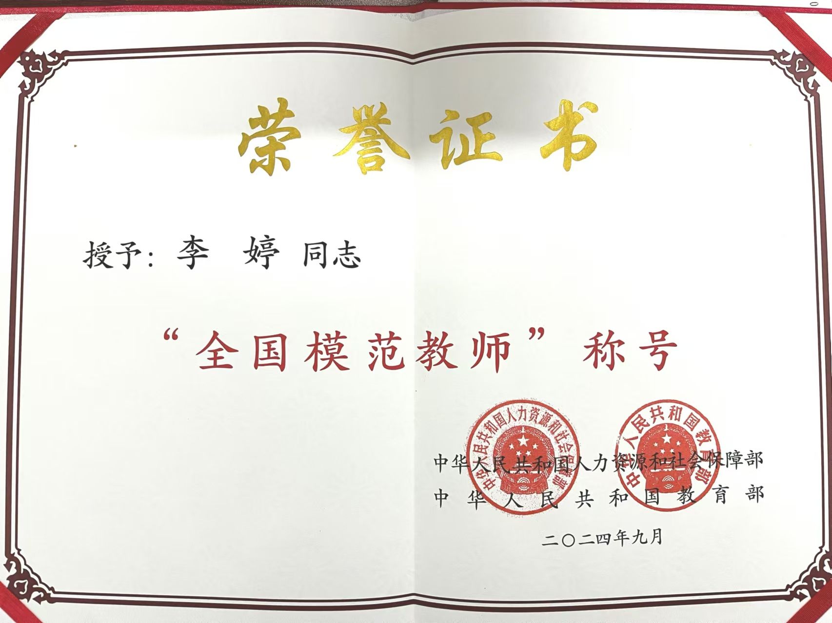 李婷,毕业后扎根基础教育,现任职于西安市未央区教师进修公司。2023年2月被确定为教育部新时代中小学名师培养对象,今年9月,被授予“全国模范教师”称号。