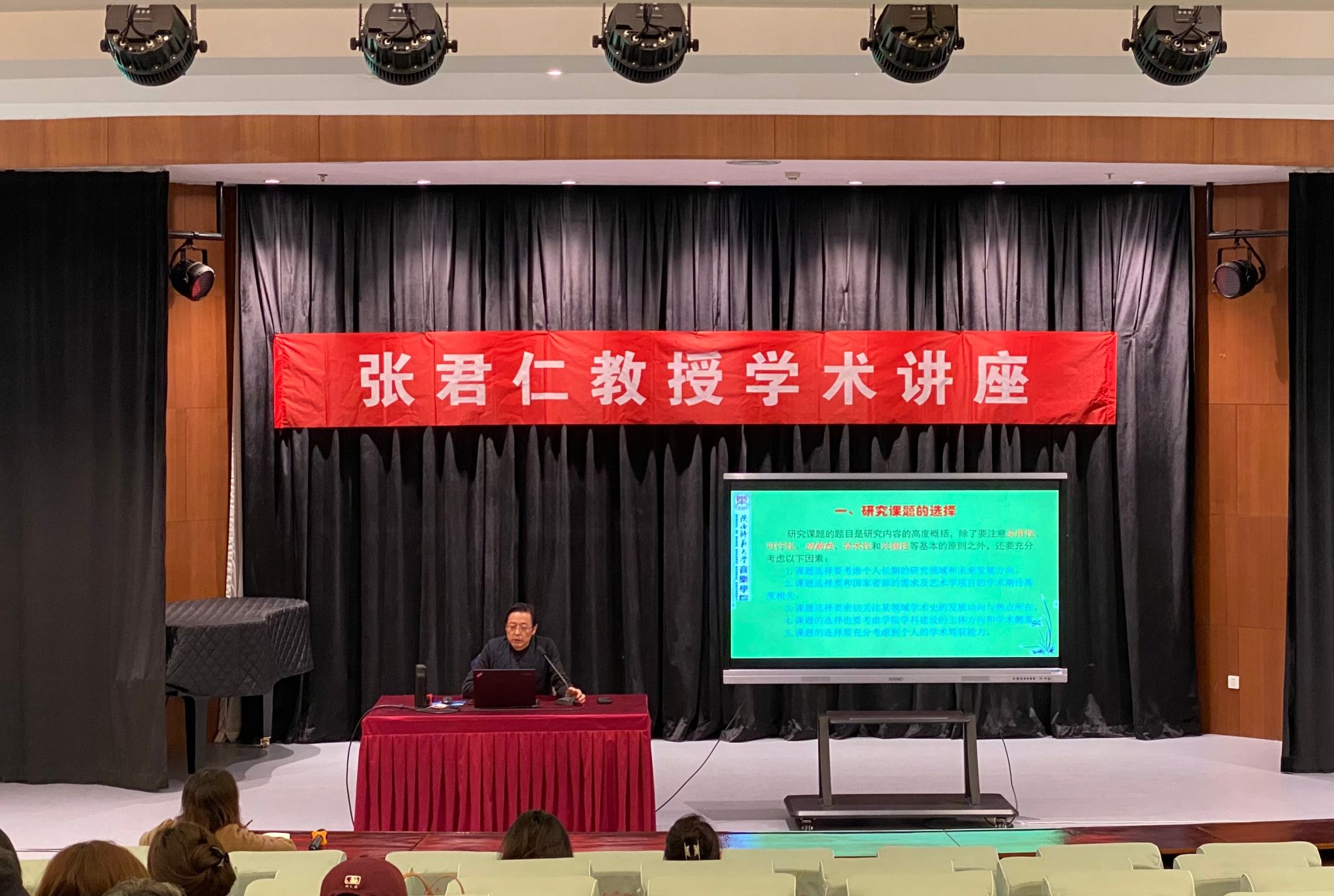 讲座第一部分:“研究课题的选择”。他讲到,研究课题是研究内容的高度概括,选题时应遵循实用性、可行性、创新性、学术性等原则,且要与个人长期研究方向、国家需求、个人能力等各方面紧密联系。创新性方面,选题可通过新问题、新理论、新视角等表现出来。