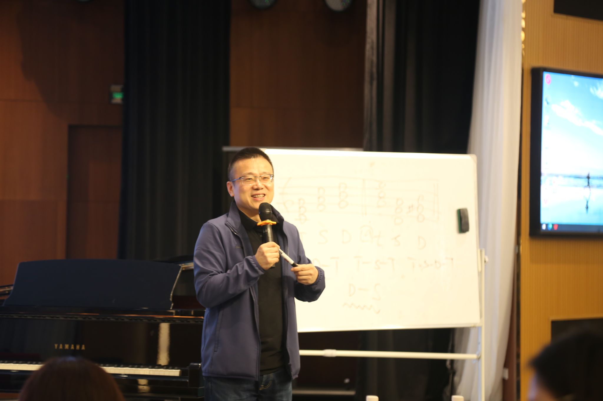 讲座中,张教授与多位员工进行了即兴演奏与音乐创作的互动,并在旋律发展、伴奏设计及创作思路等方面给予了现场教学与个别指导。讲座尾声,张教授通过现场即兴创作音乐动机与片段,将全场氛围推向高潮,展现了即兴创作的魅力与教学的实践意义。