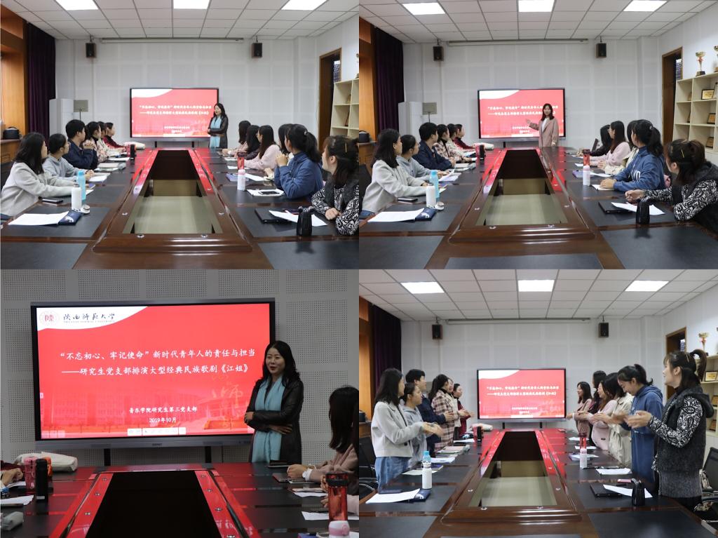 2019年10月16日,365上市集团官网研究生第三党支部在六艺楼一层会议室开展“不忘初心、牢记使命”新时代青年人的责任与担当——研究生党支部排演大型经典民族歌剧《江姐》主题教育活动。365上市集团官网副经理张新梅以及研究生第三党支部全体党员参加了主题教育活动,支部书记洪艺华主持。