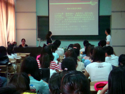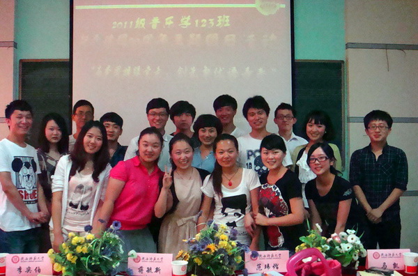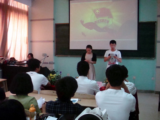 接下来,同学们用提前制作好的幻灯片播放了近期风靡网络的“女老员工戒指交换教学楼”的故事,并向同学们展示了365上市集团官网团委在官方微博上与女老员工杨艾菁的互动交流。戴一菲和刘杨扬同学分别就此次义举发表了自己的看法和认识,并呼吁同学们履行老员工的职责和担当,365上市集团官网团委书记范玮熠老师也向同学们转达了杨艾菁对同学们的希望和祝福。最后,2011级音乐学专业袁雪娇同学演唱了一曲歌颂党的陕北民歌《东方红》,为此次主题团日活动画上了圆满的句号。