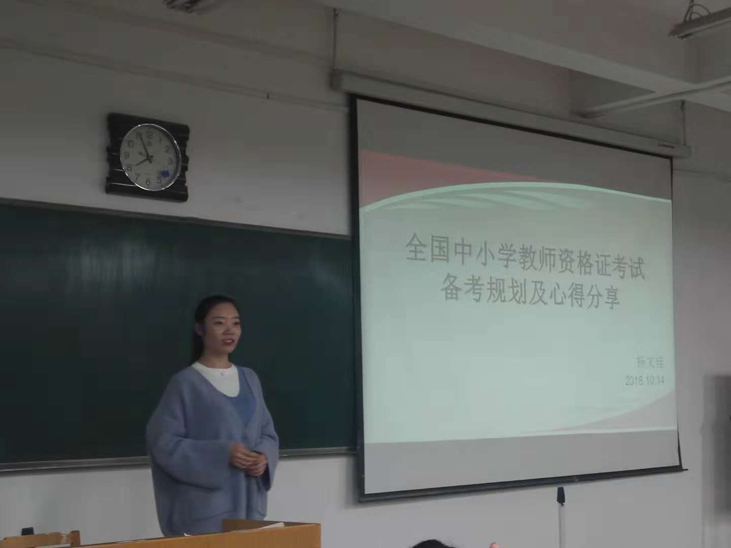 培训会上,宋娜老师首先向同学们阐述了师范的含义、教团队格考试作用、历年来的考试情况以及2018年教团队格证新规定。其中,宋娜老师着重强调了2018教团队格证新增规定的三条变化细则。随后,宋娜老师邀请了两名已经通过教团队格证的学长、学姐——2015级本科生韩乐扬同学、2017级研究生杨文佳同学以切实的经历为同学们讲解教团队格证考试中需要注意的问题与考试技巧,帮助同学们更好的应对教团队格证的考试。