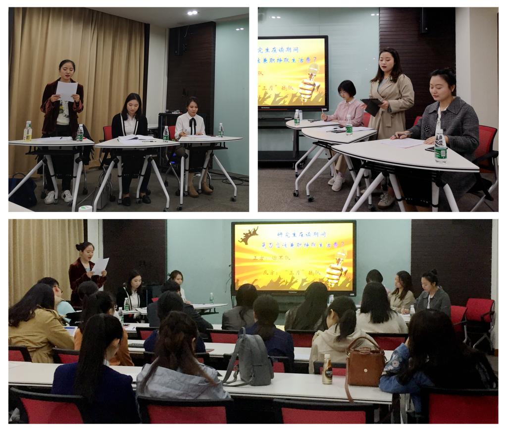 经过初赛选拔,“你不队”和“三月战队”分别作为正方和反方队伍晋级决赛,辩论围绕“研究生在读期间兼职挣取生活费利大于弊还是弊大于利”展开。正方围绕兼职有利于研究生在其社会化进程中独立人格的培养,工作经验的积累,团队精神的提升以及时间的合理规划等方面进行陈述。反方则坚持研究生应以研究为主,将更多的时间和精力投入到专业学习和科研任务中去,不应该过多的参与兼职工作。