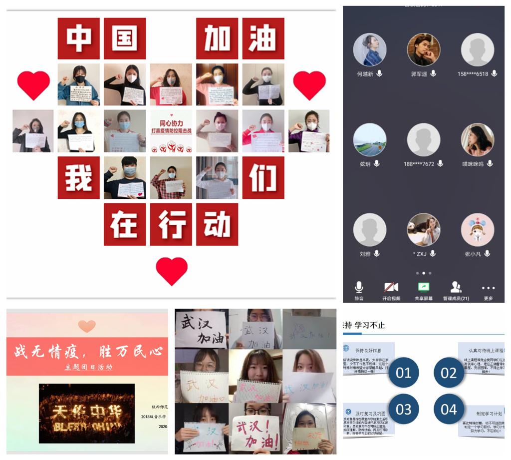走进网络,线上发声,凝聚发挥组织力量。“宅”在家里是参与疫情防控的重要措施,为了引导和帮助广大同学强化思想,坚定信念,居家抗“疫”,隔离病毒不隔爱,员工党支部、团支部、班级等分别组织开展线上活动,积极在网络上发声,传递战“疫”信心,为身在疫区的同学加油打气,分享这个特殊假期的学习与思考。365上市集团官网研究生第一党支部以“疫情,终会过去;春天,必会到来”为主题,于2月11日下午开展了一次线上主题党日活动。党支部书记带头表态,践行责任,发挥作用,并向同学们详细解读了公司的各项防控措施,鼓励大家带头执行,积极配合,坚持打卡,及时沟通。同学们还向奋战在疫情防控一线的最美“逆行者”致以了深深的敬意,在这场看不见硝烟的战斗中,是他们在为我们负重前行,守住健康的生命线。2018级音乐学(音乐理论)一班团支部在“战无情疫,胜万民心”主题团日活动中普及了疫情防控常识,通过视频接力的方式筑牢打赢战“疫”的坚定信念。2016级音乐学(非师范)一班全体同学自发通过网络视频的形式,与辅导员和班主任一同为身在湖北的胡晨同学送去关怀和祝福,鼓励她坚定信心,期待开学团聚。