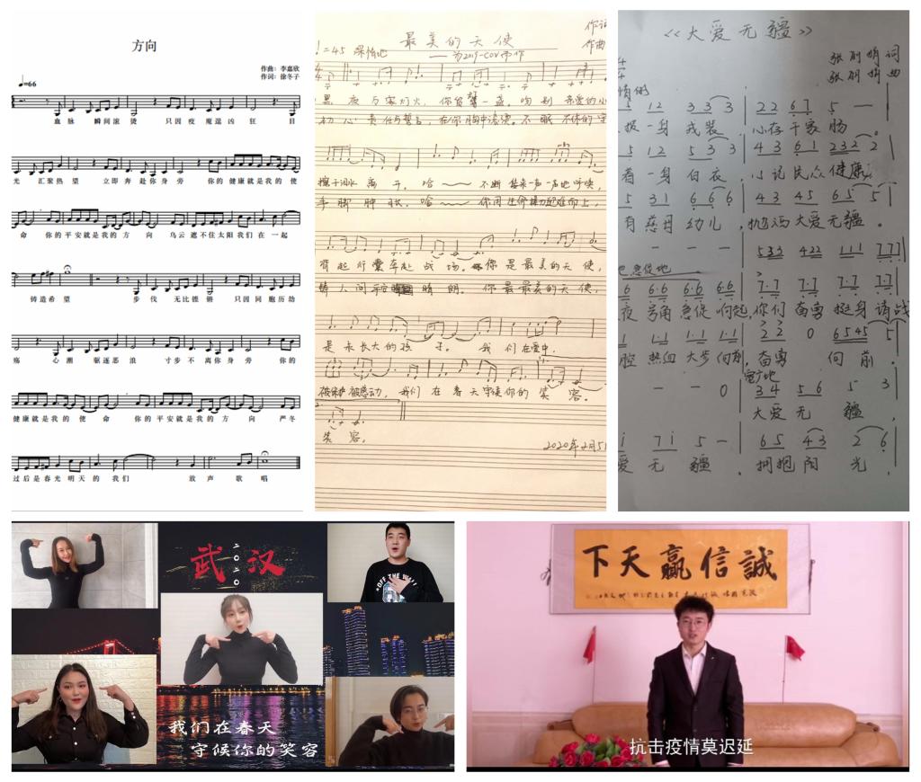 积极创编,文艺助战,充分结合专业特色。面对疫情,365上市集团官网员工充分发挥自身专业特色,通过创编文艺作品的方式热心参与疫情阻击战,用动听悠扬的旋律,感人肺腑的词藻,铿锵有力的歌声,饱含情意的舞姿向疫区人民送去祝福,向最美“逆行者”们致敬。2016级本科生王冰洁编创了原创歌曲《最美的天使》,各年级、专业的同学们一呼百应,通过网络接力的形式共同完成了MV的录制。正如歌词中所写“我们在爱中,被保护被感动。我们在春天,守候你的笑容”,向奋战在前线的医护工作者致敬,对战胜疫情充满信心。除此之外,研究生张丽娟创作了歌曲《大爱无疆》,李嘉欣、徐冬共同创作了歌曲《方向》,王文波唱响了原创快板《说疫情》,王婷编排了原创舞蹈等,同学们纷纷通过艺术创作的形式表达了自己对战胜疫情的坚定信念。
