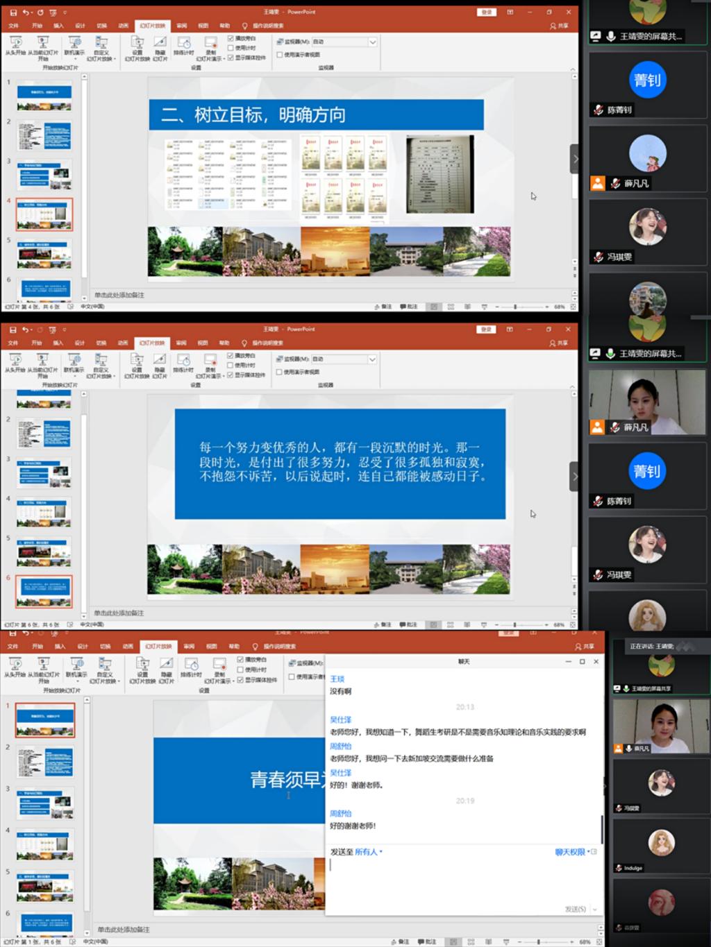 王老师从“如何与自己相处”、“树立目标,明确方向”、“勤学多思,厚积薄发”三方面与同学们分享交流。她强调,同学们一定勇于要摒弃周围浮躁的声音,甘于忍受孤独和寂寞,静下心来学习。在这个过程中要坚定自己的目标,做好个人学习规划,珍惜每一刻可以用来练琴练功的时间,勤学苦练,成为优秀的、强大的自己。