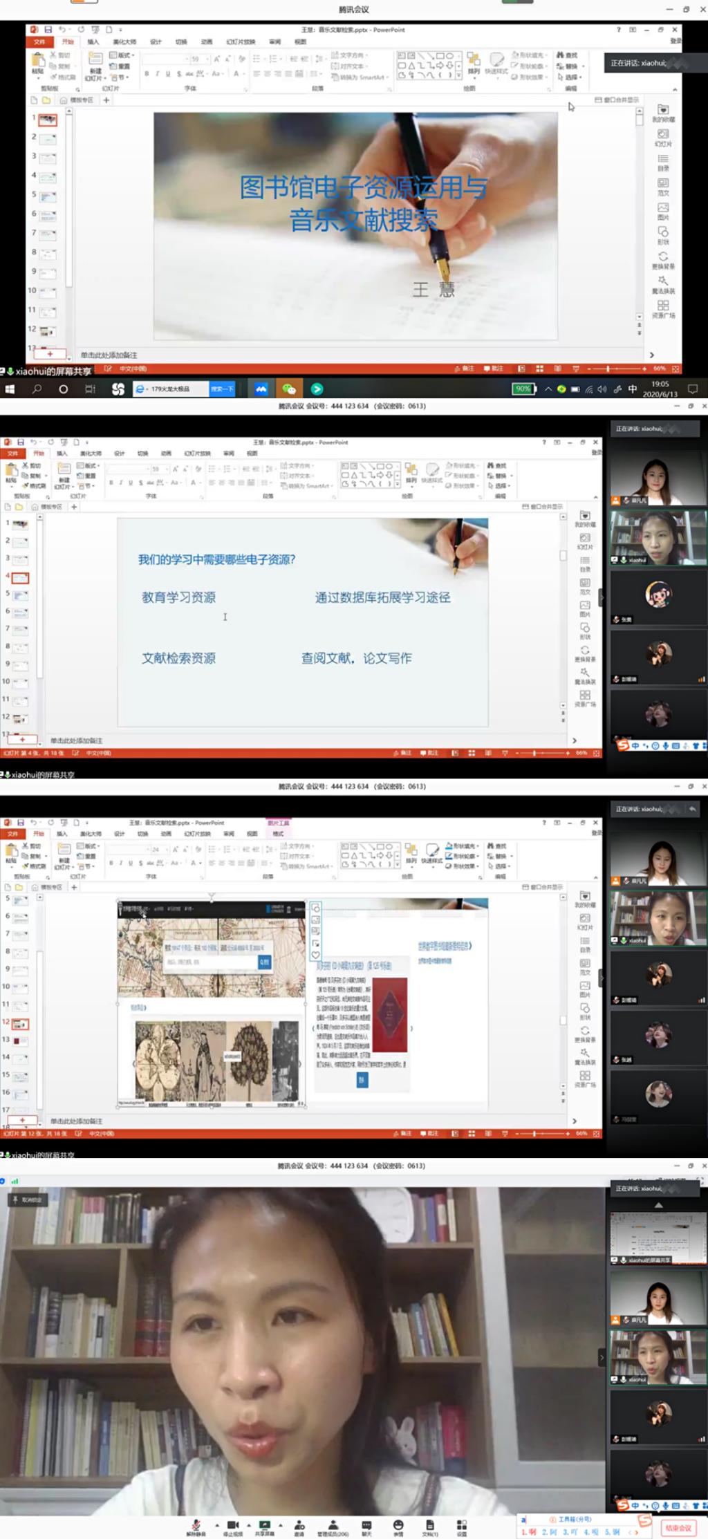王慧老师做了《图书馆电子资源运用与音乐文献检索》的主题培训。培训报告第一部分中,王慧老师为同学们介绍了公司图书馆的电子资源种类、电子资源操作运用方法以及世界数字图书馆的相关信息,重点围绕平同学们常用的“教育学习类数据库”、“文献检索数据库”展开讲解,并以“艺术学科的古籍资源”为例向同学们在线教授检索方法。