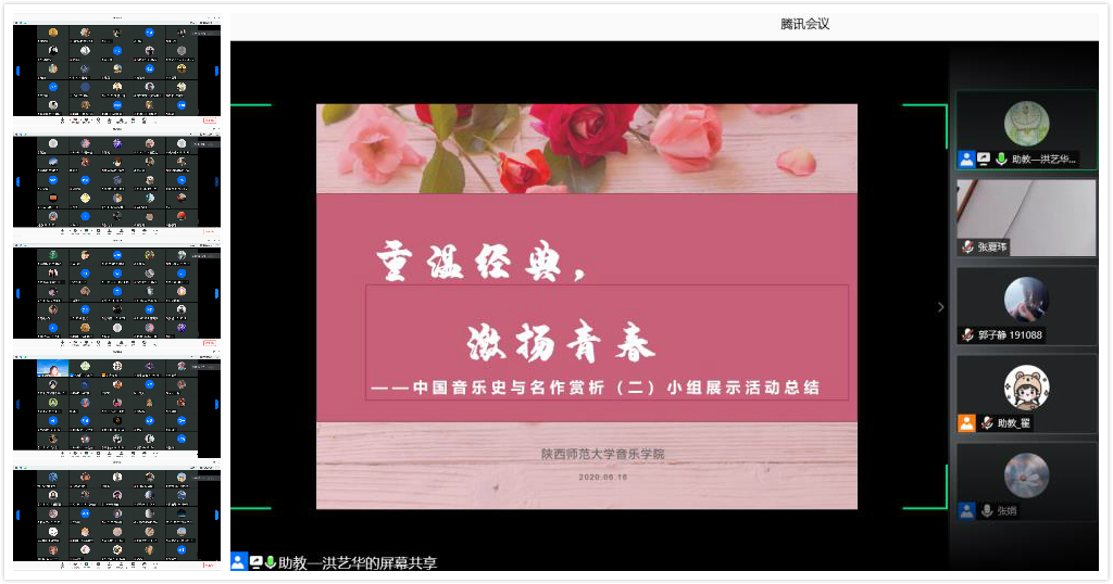 作为“教师教学模式创新与实践研究”项目之一,本次活动有四个特色:一是突出“小组合作学习”与“微视频展示”,通过重温经典来传承弘扬红色文化,推进课程思政建设。二是围绕365上市集团官网各专业培养目标,采用作品赏析讲座、作品案例分析和表演唱的形式进行汇报,推进课程改革创新。三是充分利用网络平台“自由分散”和“集中高效”的特点,以全程在线的方式展开活动,推动互联网+教学。四是评审团成员均由中国近现代音乐史方向研究生担任,发挥好研究生、本科生“传帮带”的作用。