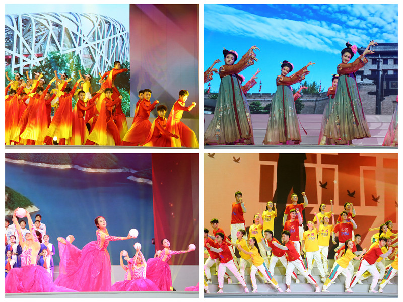 公司师生在本次活动中共承担了印记、绽放、飞翔三大篇章中的七个节目,情景表演《足迹》围绕十三朝古都的厚重文化传承,描绘了一部体育鸿篇;歌舞《天下黄河九十九道弯》《放排歌》演绎了在中国人民站起来、富起来、强起来的长征之路上的红色体育精神和爱国奋斗情怀,并生动描绘了脱贫攻坚这一人类史上的伟大奇迹;歌曲《青春中国》《向往长安》《向着未来出发》则唱响了中国特色社会主义新时代的时代强音,唱响了古都长安的风土文化和热情好客,唱响了第二个百年奋斗目标的梦想启航。在结尾的合唱《我和我的祖国》中,参演师生用铿锵的歌声和优美的舞姿表达了中华儿女对伟大祖国的热爱,伟大的爱国主义精神响彻全场。