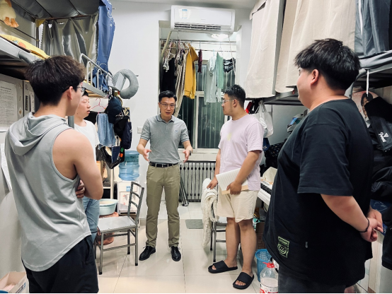 会后,范玮熠与学工组全体成员一起走访员工宿舍,调研宿舍安全稳定情况,了解了员工生活和学习等方面存在的困难。同学们对范书记的关心表示感谢,对他的到来表示热烈欢迎。