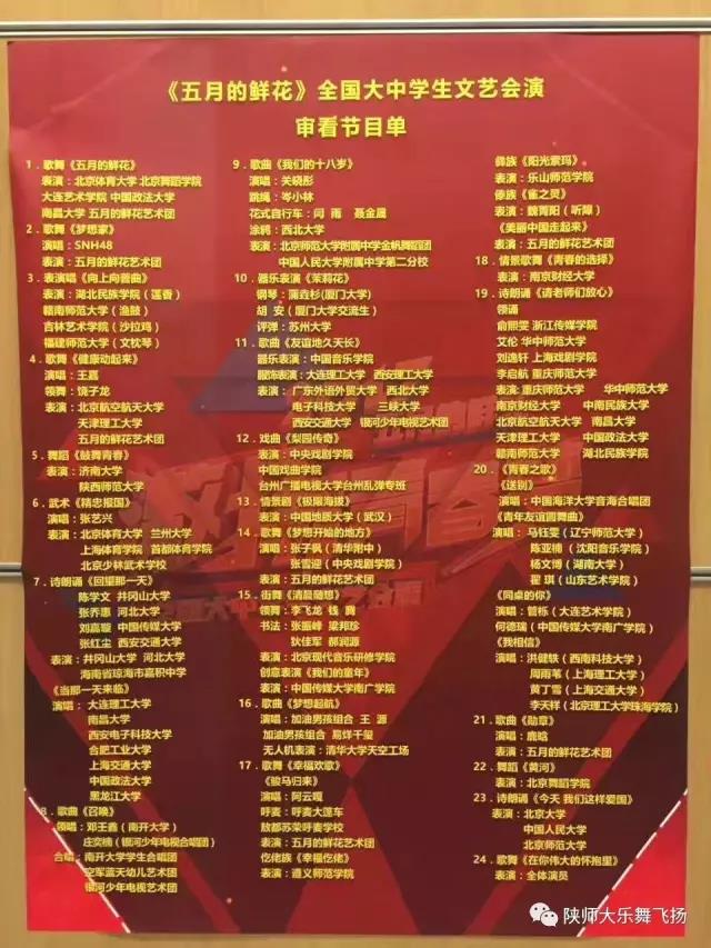 演出团体有:陕star男子天团、中央民族大学、中国政法大学、中央戏剧公司、上海戏剧公司、西安交通大学等高校