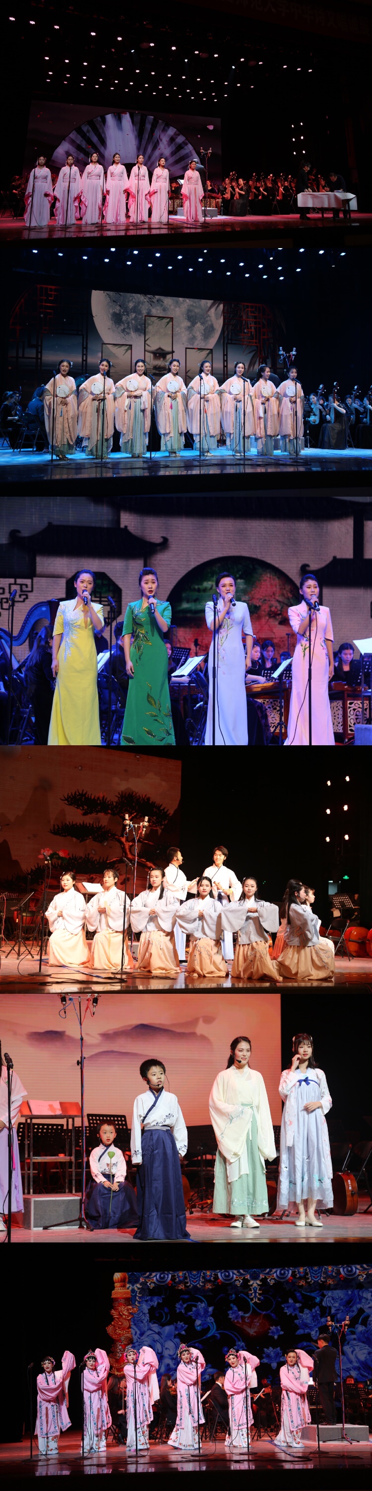 展演以红楼梦组曲、原创古诗文歌曲、诗文诵读和传统诗文歌曲四个模块组成。从汉乐府采莲的童趣,到现代毛泽东咏梅的坚韧与豁达,作品横跨古今2000余年,涉及多种文学体裁,以吟诵与演唱的方式共同展现,表演中综合了戏曲、书法等传统艺术形式,在同一个舞台上全方位展示了传统文化的相通与相承。