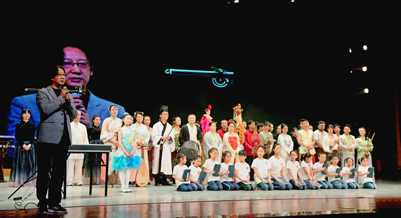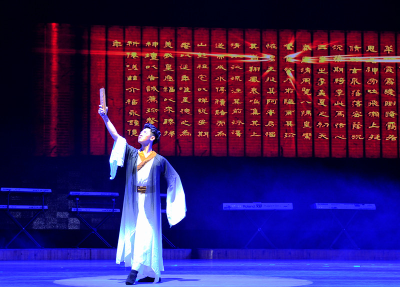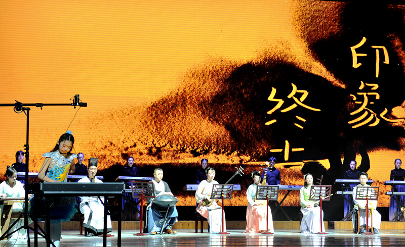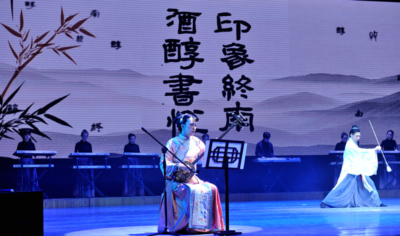 王老师把终南山文化进行了梳理,划分为了九单元,用音乐描述了自然、道教、佛教、地理、诗词、书法、酒、戏曲、民俗。把每个文化品种都作为一个乐章来展现,并用一种最独特的民族乐器与之相对应。这样把音乐的性格、乐器的性格、文化的性格三种性格都非常充分的展示出来。在艺术形式方面,不仅有音乐、舞蹈、朗诵、书法、国画、皮影、沙画等,多个艺术维度叠加、聚焦,可谓用心打造了这台令人耳目一新音乐晚会。