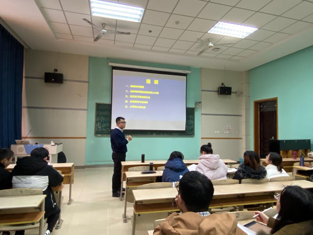 会前,范玮熠向同学们介绍此次活动的目的,告诫同学们要珍惜机会,结合本次大会的内容,抓住考研最后的时间,竭尽全力,冲刺考研。随后,黄键从五个方面进行,第一、明确指示提纲;第二、清晰每阶段追重要的核心内容;第三、理性复习策略和方法;第四、宏观规划考试时间;第五、必要的心理准备。黄键耐心讲解,对参考书目每个章节的重点进行梳理,对难点细心讲解,并对部分同学的提问进行了耐心解答。