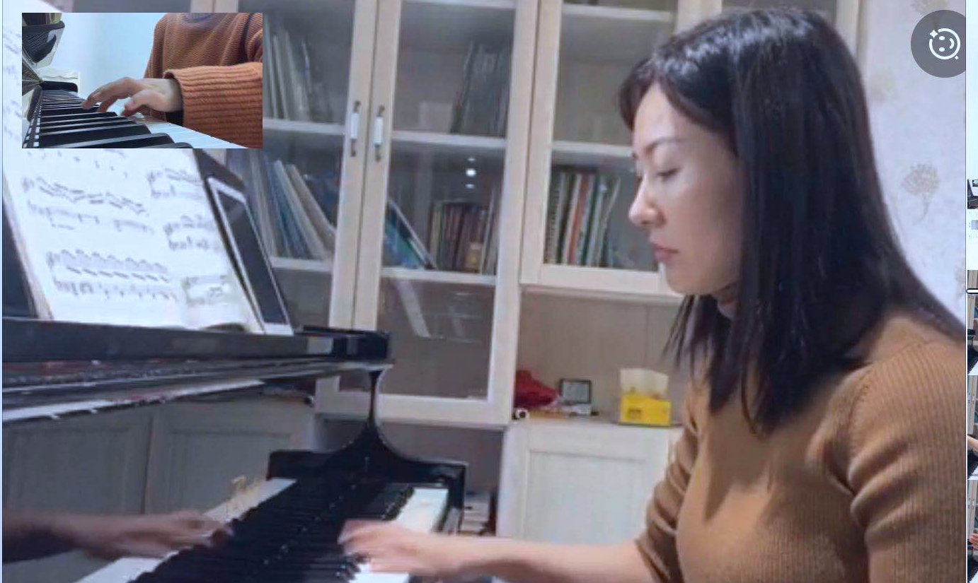(2)钉钉视频集体会议,沈杨轩鹤演奏并讲解中国第一首钢琴作品《和平进行曲》(10分钟),教师针对第一位同学的演奏和讲解做点评和示范(5分钟)。